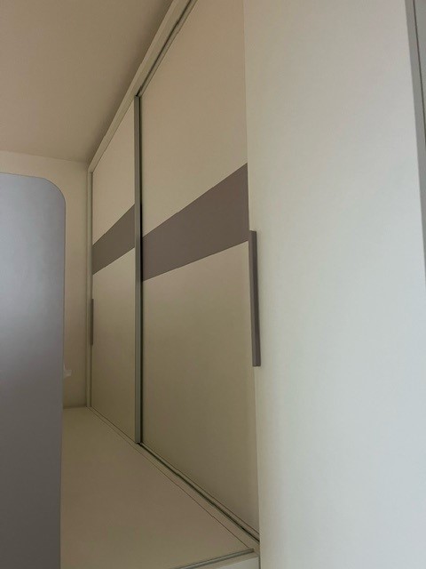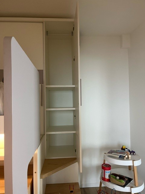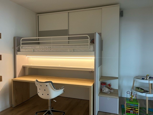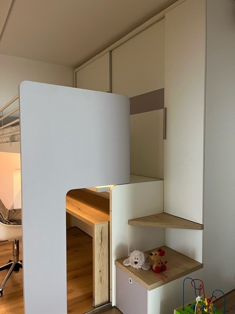 DoimoCityline cameretta salvaspazio con letto a castello realizzata con il programma “All in One” con pratico armadio con ante scorrevole sul retro, letto superiore a cui si accede con una piccola scala multifunzionale e pedana, composizione con scrittoio estraibile