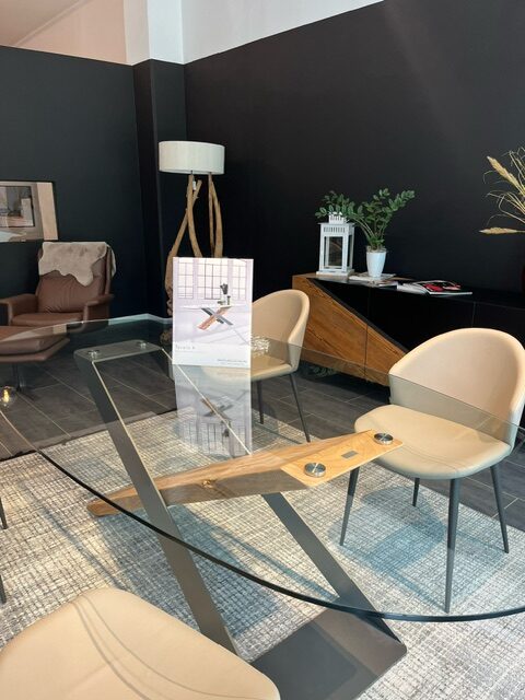 Nature Design Tavolo – X design by Andrea Lucatello finitura base metallo e legno secolare con piano in vetro, cristallo extrachiaro.